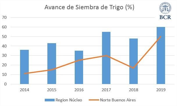 El norte bonaerense lleva el mayor avance de las últimas campañas. Allí, se lleva sembrada casi la mitad de la superficie intencionada, mientras que en los últimos ciclos el avance era de tan solo un 15% en promedio. Desde el 20 de mayo no se producen lluvias importantes y esto ha permitido un gran progreso.
