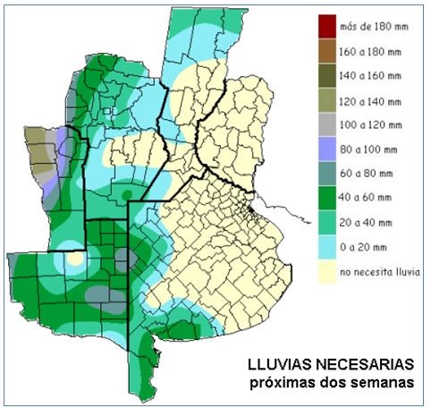 Como consecuencia de la sobreoferta de precipitaciones, la demanda de agua para las próximas dos semanas es nula sobre el este y no es significativa sobre el oeste. Las recargas en el sudeste de BA, garantizan el proceso de siembra y la evolución de la fina durante todo el invierno. El núcleo triguero tributario de Rosario también queda bien provisto, quizá el sur de CB, la provincia de LP y sectores del oeste bonaerense se vean más ajustados para el desarrollo de la fina, la cual, incluso en esta zona puede llevarse a cabo con los cuidados agronómicos pertinentes a un perfil de humedad que se presenta más necesitado de agua.