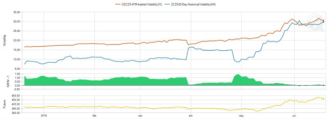 En el caso de la soja esta situación comenzó a revertirse más o menos hace un mes. A mediados de mayo, los cambios de precios fueron bruscos y por lo tanto el riesgo o variabilidad presentes en el futuro aumentaron, es decir aumentó la volatilidad histórica. Sin embargo, la percibida por los compradores de opciones, no cambió demasiado. De hecho, durante algunos momentos breves, se observa como la volatilidad pagada en el mercado es inferior a la realizada.