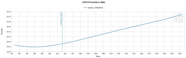 Las volatilidades implícitas se calcularon tomando como prima potencialmente negociada al promedio entre la oferta compradora y vendedora durante la sesión de negocios del día 19 de junio de 2019.