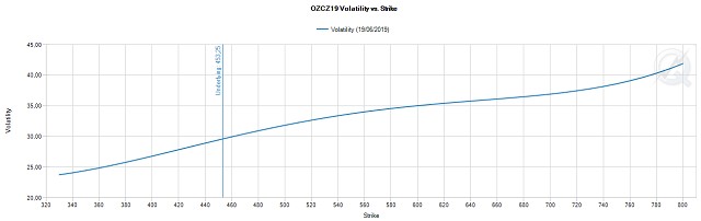 Gráfico 3: Curva de volatilidad de las opciones sobre soja noviembre el 19.06.19 en CME Group.