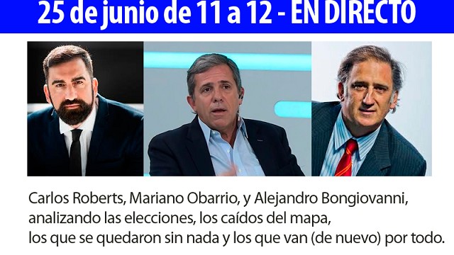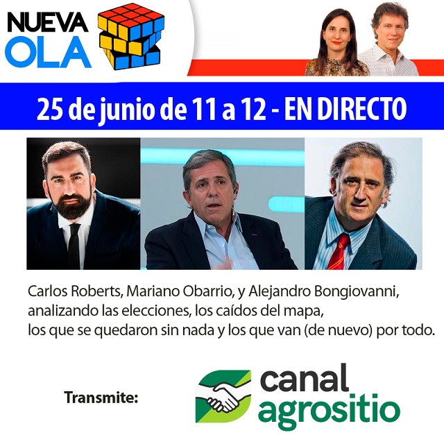 En Agrositio te preparamos el mejor desayuno de tu vida. El experto en "cristinismo" y autor de "Cristinamente" Carlos María Reymundo Roberts,el director de Fundación Libertad Alejandro Bongiovannii, el periodista histórico de todas las presidencias Mariano Obarrio, entrevistados por Ricardo Bindi y Mercedes Colmbres, analizando las elecciones, los caídos del mapa, los que se quedaron sin nada y los que van (de nuevo) por todo. Imperdible en vivo por Agrositio, el canal que te lleva el Círculo Rojo a tu casa!