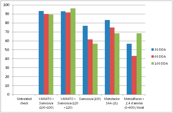 Sumisoya TOP (flumioxazin) más Yamato aporta un plus de control de hoja ancha como Veronica, Lamium, Viola, Capiqui y crucíferas entre otras que son malezas muy frecuentes de emergencia conjunta con trigo y cebada.
