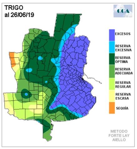 Como puede apreciarse, las reservas de humedad decrecen hacia el oeste, siendo al presente mejor la condición de humedad sobre CB. Una zona que mayoritariamente no está complicada por los excesos hídricos.