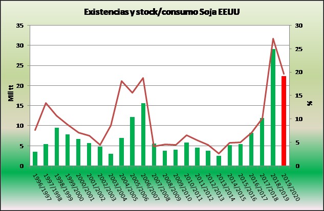 A partir de esto, y tomando en consideración que USDA está previendo rindes en 33.3 qq/ha (posiblemente la productividad se vea recortada en los sucesivos recortes por el retraso en la implantación), el output norteamericano 19/20 por ahora alcanzaría a 107 mill tt (esto queda reflejado en el gráfico 4, sería 6 mill tt más que lo presagiado hasta el momento y prácticamente 17 mill tt por debajo del output del ciclo previo).