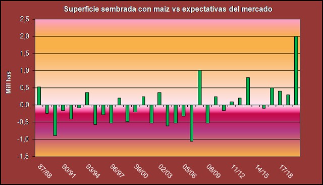Esta situación se explica como consecuencia de que los analistas apuntaban a un área final de 35.1 mill has, y en su lugar lo informado por el organismo ha arrojado 37.1 mill has. Como deja entrever el gráfico 5 nunca la brecha ha sido tan grande en alguno de los dos sentidos, tomando en cuenta que las máximas sorpresas en el pasado se habían verificado en 06/07 y 07/08 con aproximadamente 1 mill has en cada caso.