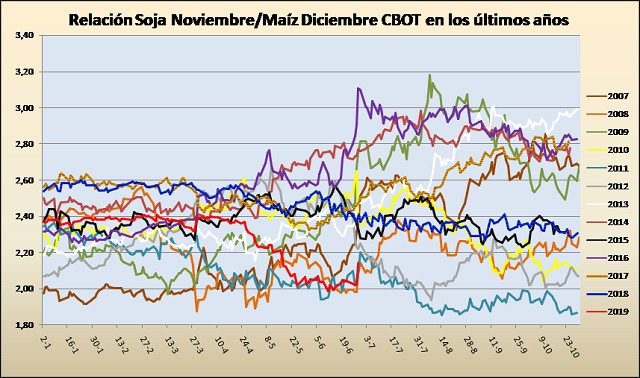 La relación soja noviembre/maíz diciembre en Chicago, más allá de recuperarse en forma brusca tras la difusión del informe, continúa reflejando que la situación del maíz es mucho más incómoda que la de la soja en EEUU.