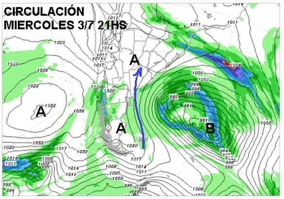 La zona de alta presión sobre el Pacífico sur (A), ya presentara para la noche de hoy una fuerte influencia sobre toda el área continental. Este campo de presión contrasta con las bajas presiones (B) que ya se internan en el océano. Este contraste bárico induce una intensa circulación del sur que despliega el aire frío sobre todo el país, alcanzando latitudes tropicales. Con la entrada de altas presiones al continente, la estabilidad se afianza, los vientos pierden intensidad y el aire frío se estaciona y promueve condiciones ambientales que pueden considerarse rigurosas entre el jueves y el sábado. Las heladas pueden alcanzar incluso la provincia de Formosa.
