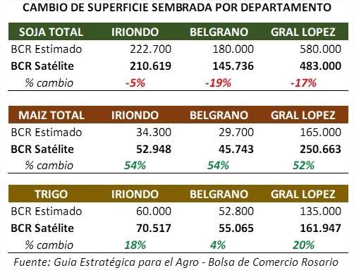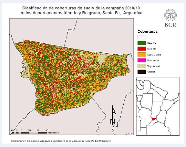 El ajuste de área se realizó utilizando la herramienta Google Earth Engine, una plataforma on line de código abierto para la visualización y procesamiento de imágenes satelitales. El equipo de GEA realizó el relevamiento en el centro- sur de Santa Fe en los departamentos de Iriondo, Belgrano y General López. En esta zona de estudio se analizó un conjunto de imágenes de los satélites Landsat 8 y Sentinel-2 en diferentes fechas, coincidentes con el periodo crítico para cada cultivo: trigo, maíz y soja. Así se llegó a una clasificación de cobertura de suelo con una precisión global cercana al 90%. Los resultados obtenidos muestran una clara tendencia en el crecimiento del área del doble cultivo y el maíz y una menor superficie sembrada de soja de primera.