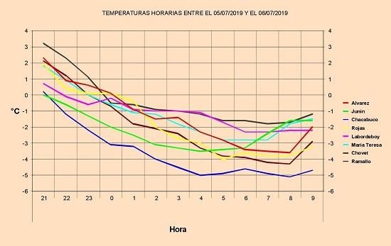 Algunos de los registros destacados tanto por sus marcas mínimas como por su duración por debajo de los ceros grados son: Chacabuco (-5,2°C), Canals (-5°C) y Gral. Pinto (-4,7°C) que llegaron a las 14 horas con el termómetro en negativo.