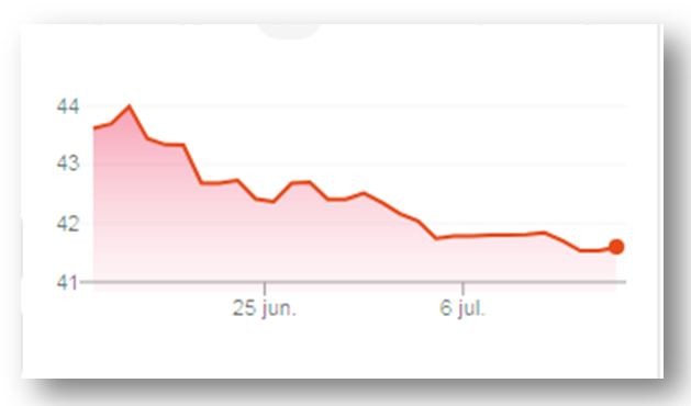 Mientras tanto, en el mercado local sigue pesando negativamente, el tipo de cambio en baja. El gráfico muestra el recorrido en los últimos treinta días.