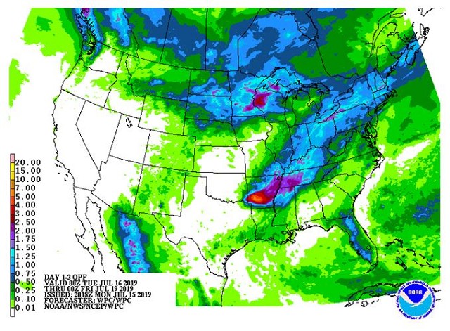 Veamos los pronósticos. El National Weather Service de EE.UU. genera expectativas de lluvias para la zona agrícola en los próximos días.