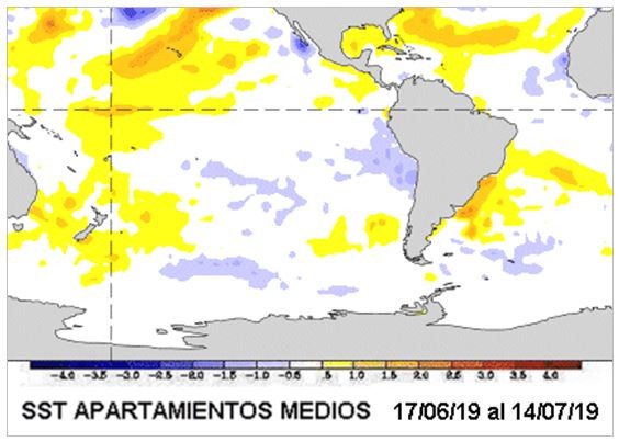 El mapa que muestra el promedio de anomalías de dos semanas del mes de junio y dos semanas de julio, presenta un debilitamiento del desvío positivo en la zona central del Pacífico Ecuatorial, destacándose una fuerte anomalía cálida en la zona de influencia de la corriente oceánica de Brasil. Es decir, el litoral Atlántico fue un indicador propositivo a la hora de aportar humedad al continente. Bajo las condiciones de circulación adecuadas, esta cantidad extra de vapor de agua fue transportada a las regiones productivas de Argentina y Uruguay fundamentalmente, favoreciendo el despliegue continuo de lluvias y lloviznas a lo largo de diez días durante junio.
