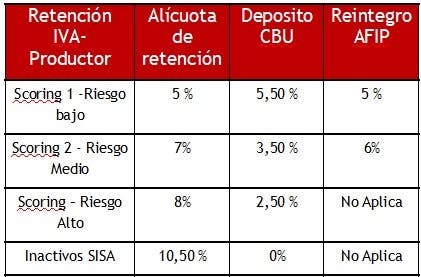 Así, se estableció un régimen de retención del Impuesto al Valor agregado (IVA) en un porcentaje que varía según sea el nivel de riesgo asignado al productor por el sistema de scoring vigente, y que detallamos a continuación: