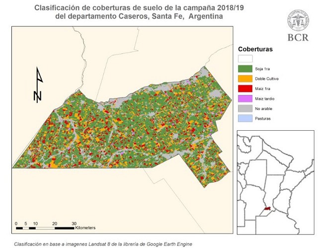 Un nuevo departamento pasó bajo la mirada de los satélites Landsat 8 y Sentinel-2. El turno esta vez fue de Caseros; en el sur de Santa Fe. El estudio de clasificación supervisada con verdad terrestre realizado en la plataforma Google Earth Engine (Random Forest) muestra pocos cambios respecto a las estimaciones previas. Se destaca una caída en el área de soja total de 14 mil hectáreas. Le sigue el maíz con un cambio negativo de 7 mil hectáreas. El trigo que presenta un leve ajuste de 2 mil hectáreas.