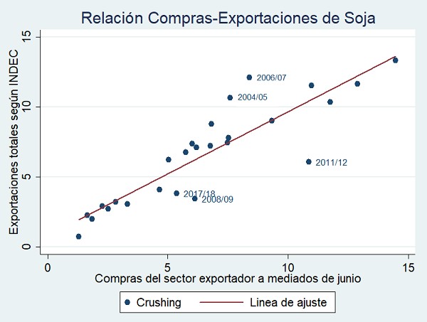 Se esperan exportaciones de poroto de soja sin procesar esta campaña en 8 (Mt). Según el gráfico adjunto, se puede ver cómo las compras de soja por parte del sector exportador a mediados de junio permiten dar una estimación de las exportaciones totales de la campaña, salvo en los años de sequía (esto hace que los granos comprados, antes de conocerse los números finales de producción, que se realizaron bajo modalidad forward, se vendan a la industria para su posterior molienda). Las compras del sector exportador al 19 de junio alcanzan 6,42 Mt.