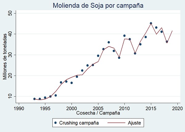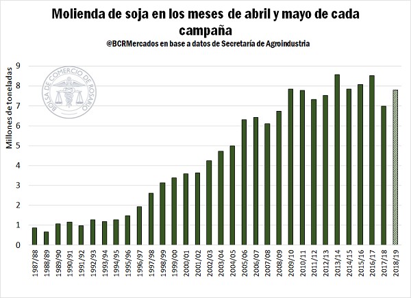 Para la campaña 18/19, se espera que se recupere la molienda de soja en Argentina debido a la mayor producción de la oleaginosa a nivel local, que se estima en 56,5 millones de toneladas (Mt), marcando un aumento sustancial desde los 35 Mt de la campaña 17/18. Aun así el número de molienda estaría por debajo de campañas con producciones similares.