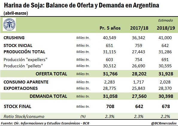 El total estimado para la campaña 18/19 es de 41 millones de toneladas de soja industrializada. El producto de esta industrialización se divide en expellers y harina de soja de extracción, ambos subproductos se derivan de dos métodos de producción diferentes, por prensa y por solvente respectivamente (cuando se habla de harina de soja, muchas veces se refiere a ambos subproductos. Al número de harina de extracción se adiciona también los pellets de cáscara soja).