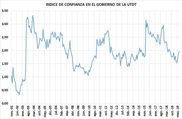Luego del acantilado que es la curva desde noviembre de 2017 hasta abril pasado, en los últimos tres meses hay una recuperación importante. En julio la confianza en el gobierno, siempre de acuerdo al índice que publica la Universidad Torcuato Di Tella, aumentó el 6,1% respecto a junio y el 28,8% respecto al piso de abril. En definitiva, el gráfico muestra que al menos la economía ya no le juega en contra al gobierno. Aclaro que toda esta tranquilidad cambiaria y con baja de la inflación es forzada y artificial, pero le funciona al gobierno para llegar a las elecciones sin desbordes cambiarios y una inflación más potable para el standard inflacionario de Argentina.