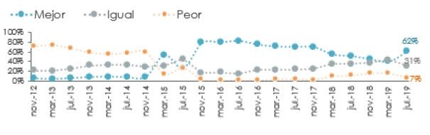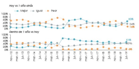 En lo que respecta a la situación actual económica y financiera de la propia empresa, la mitad de los encuestados dijo que era mejor que un año atrás, mientras que otro 34% aseguró estar igual y apenas un 16% señaló encontrarse en una condición más desfavorable. Se trata también de una recuperación muy significativa luego del descenso de la percepción de la propia situación que se venía registrando desde marzo de 2017. En cuanto a las expectativas, un 51% de los encuestados cree que su empresa estará mejor dentro un año y otro 43% aseguró que no prevé mayores cambios, mientras que solamente un 6% se mostró pesimista.