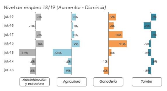 También se verifica una mejora en relación a los planes de contratación de personal y el ánimo para realizar inversiones. Para empleo, en todas las actividades son mayoría los empresarios que proyectan incrementar la dotación en sus empresas, y especialmente se destaca el sector ganadero. En tanto en inversiones, se registra una sustancial mejora en la percepción del momento para realizarlas. "El indicador de inversiones surge de la diferencia entre el porcentaje de empresarios que considera que es un buen momento para realizarlas y los que consideran que es un mal momento. Este indicador mejoró 30 puntos porcentuales en comparación con la encuesta anterior (marzo 2019). Sin embargo, aún se mantiene en valores negativos (-15%), similares a los que registraba en marzo y julio de 2018" indicó Barelli, técnico de la Unidad de Investigación y Desarrollo de AACREA.