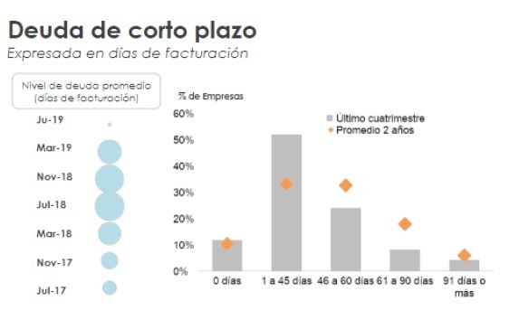 En el último cuatrimestre la deuda de corto plazo de las empresas tamberas CREA promedia 35 días de facturación, lo que representa 12 y 18 días menos que la media de marzo pasado y de julio de 2018, respectivamente. El 52% de las empresas tiene una deuda de corto plazo que equivale a entre 1 y 45 días de facturación.