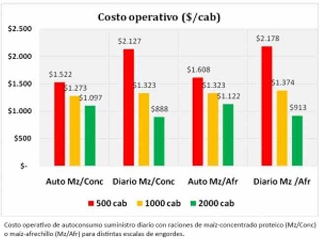 Los costos operativos fueron estimados para escalas de 500 a 2.000 cabezas/año, considerando la diferencia en el tiempo efectivo de trabajo del personal entre los métodos de ofrecimiento. En el caso del autoconsumo se tuvo en cuenta el suministro semanal más la observación diaria de los comederos.