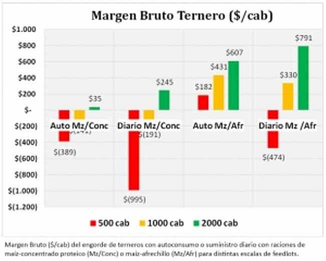 En escalas mayores a 1.000 cabezas, los resultados son positivos en los sistemas que utilizan maíz-afrechillo y negativos en los de maíz-concentrado proteico, independientemente del método de suministro. Los márgenes más bajos se obtienen con el sistema maíz-concentrado, siendo peor si es suministrado en autoconsumo.