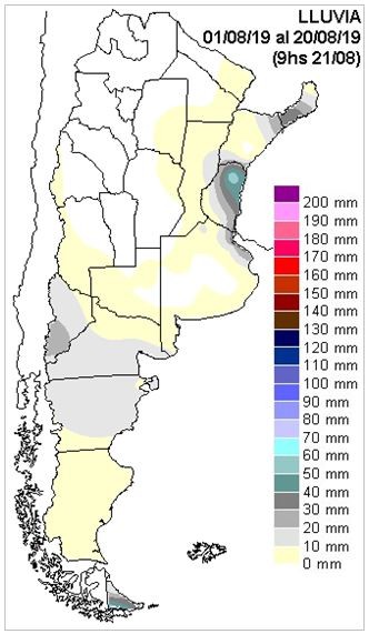 En lo que va del mes de agosto, las lluvias solo se han reportado desde las provincias mesopotámicas y las inmediaciones del estuario del Río de la Plata. La oferta de agua sumó apenas unos milímetros en SF, BA y LP, con algunas lloviznas en la provincia de CB. En el mapa se observa con claridad este comportamiento, con un máximo sobre el centro noreste entrerriano. Incluso sobre la cordillera patagónica las lluvias y nevadas no han sido demasiado importantes.