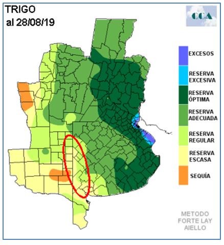 Como muestra el mapa, las reservas por el momento tienen margen para abastecer a los cultivos de invierno, pero evidentemente la demanda de precipitaciones comenzará a presionar sobre la zona oeste durante la primera quincena de septiembre.