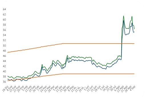 Veamos el cuadro del recorrido del dólar durante este año. Las líneas naranjas muestran la banda superior e inferior. La verde es el minorista. Y la azul la mayorista.