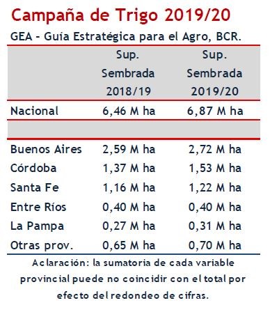 Si bien los guarismos de superficie del trigo 2019/2020 seguirán revisándose mensualmente, hasta llegar a la configuración final, en el presente informe se estima un área total de 6,87 millones de hectáreas.