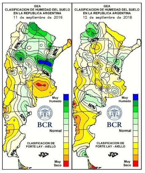 Afortunadamente en las últimas 48 horas el desarrollo de algunas lluvias y tormentas aisladas han dejado acumulados moderados sobre parte de Córdoba, Santa fe y norte de Buenos Aires, mejorando las reservas en el corazón de la región núcleo. Tras un agosto deficitario de agua y con un mes de setiembre con eventos de lluvias más bien modestas, que han privilegiado al noreste del país y parcialmente a la franja central, el trigo cumple con sus etapas de macollaje, encañazón y espigazón. Y mientras tanto, el déficit hídrico se agrava hacia el sur de la región pampeana. Las enfermedades han aparecido pero se mantienen en niveles moderados. No son una preocupación en este momento, pero puede haber un gran desarrollo si se impone un régimen térmico más propio del mes. La incertidumbre pasa por el hecho de que semana a semana, el área con reservas escasas de agua se haya ido pronunciando. La sequía se despliegue con un contundente avance en el sur de la región pampeana, amenazando seriamente el desarrollo de los trigales.