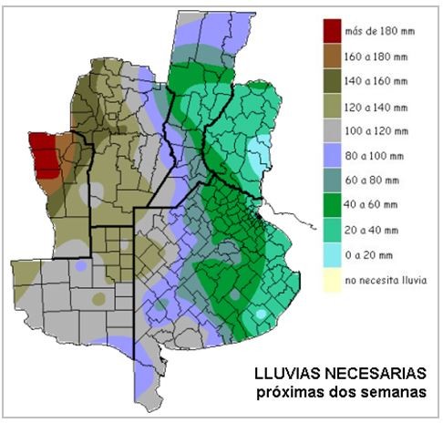 Este ejercicio arroja un nivel de demanda muy superior al que estadísticamente puede ser satisfecho por las lluvias en esta época del año sobre la franja mediterránea. Observemos que la línea de ochenta milímetros ya se desplaza hacia el sur santafesino y avanza sobre territorio bonaerense.