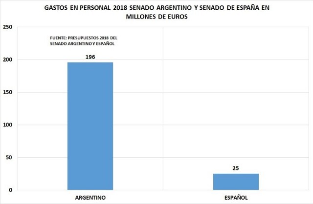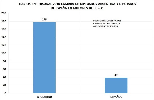La Cámara de diputados de Argentina gasta 4,6 más en personal que la de España y la Cámara de Senadores de Argentina gasta 7,8 veces más que la española en personal.