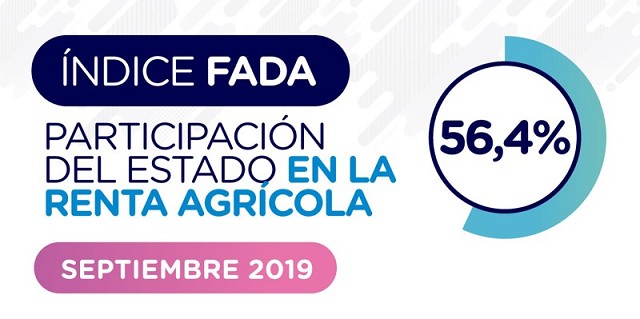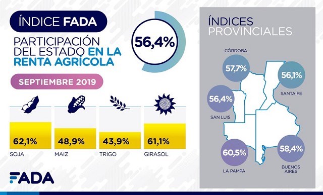Como cada tres meses, FADA (Fundación Agropecuaria para el Desarrollo de Argentina) presenta su Índice FADA. La medición de septiembre 2019 reveló que el 56,4% de la renta agrícola se distribuye en distintos niveles del Estado. Es decir que, de cada $100 que genera el campo, $56,4 van a los gobiernos: municipal, provincial o nacional. En este estudio, la renta es entendida como el resultado del valor de la producción menos los costos.