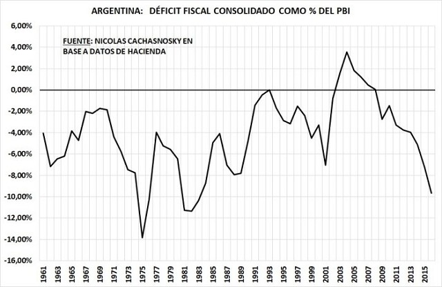 El gráfico 1 muestra la evolución del déficit fiscal consolidado entre 1961 y 2016 en base a datos del Ministerio de Hacienda.
