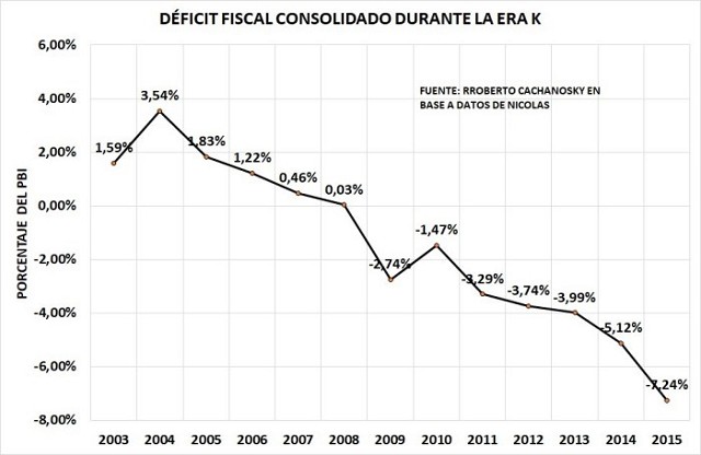 Tomando los 55 años que van entre 1961 y 2016, en solo 6 de ellos hubo superávit fiscal. En rigor es superávit fiscal estuvo basado en la llamarada inflacionaria que generó Duhalde con la salida de la convertibilidad licuando el gasto público en salarios y jubilaciones. Si a eso se le agrega que Rodríguez Saa había declarado el default y ya no se pagaban los intereses de la deuda pública y se establecieron retenciones a las exportaciones con un tipo de cambio de 4 pesos por dólar, lo que se hizo fue licuar el gasto y no pagar la deuda, más que ordenar el estado para bajar el gasto público. Es más, el gráfico 2 muestra la evolución del resultado fiscal en la era k. Como puede verse, comienza el 2004 con un superávit consolidado del 3,54% del PBI gracias al viento de cola y al desastre económico institucional que hizo Duhalde, y terminaron entregando el poder en 2015 con un déficit fiscal de 7,24% del PBI. Un recorrido de deterioro fiscal de casi 11 puntos del PBI.