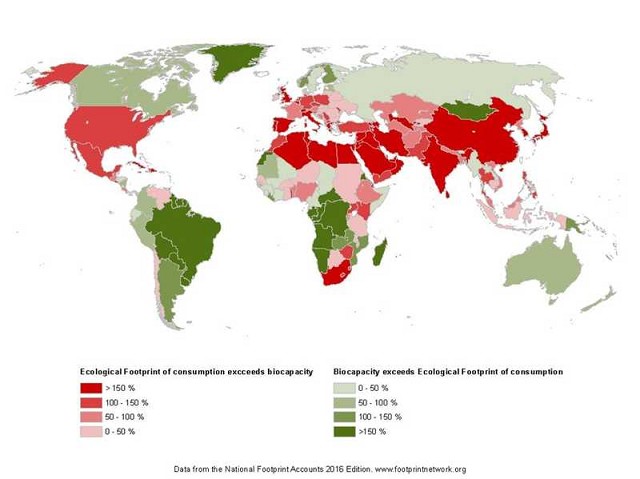 Así, si un país tiene una huella ecológica que excede su biocapacidad, se considera que tiene un “déficit ecológico” y termina satisfaciendo su demanda importando recursos, liquidando sus propios activos ecológicos (como la sobrepesca), y/o emitiendo dióxido de carbono excedente a la atmósfera.