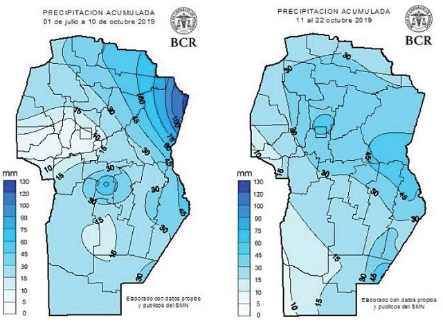 A partir de la segunda decena de octubre se quiebra la tendencia de lluvias irrisorias. La provincia recibe en 10 días casi los mismos acumulados que recibió en los últimos 100 y en algunas localidades casi quintuplicaron la marca. La capital cordobesa que había acumulado 10 mm en 100 días, en los últimos 10 días recibió 51 mm; Pozo del Molle en 100 días marcó 16 mm y en los últimos 10 días registró 51 mm. Río Cuarto acumuló prácticamente la misma cantidad: 16,5 mm y 18 mm, en los 100 y en los últimos 10 días, respectivamente.; al igual que Laboulaye que marcó 16 mm en 100 días y 16, 5 mm en 10 días. Además, la distribución de las lluvias fue más homogénea. La mitad este de la provincia acumuló entre 30 y 45 mm, mientras que al oeste las lluvias quedaron ente 15 y 30 mm.