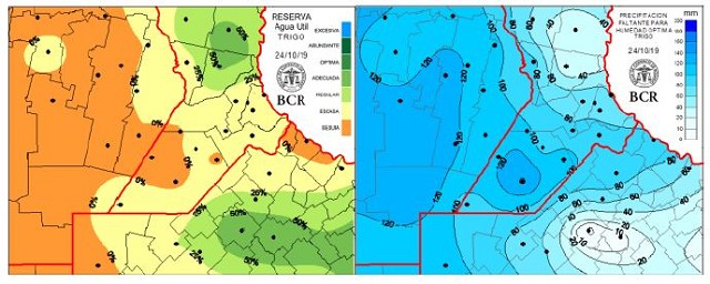 Durante la última semana las precipitaciones se mostraron mucho más generosas hacia el oeste de la región. Las zonas más favorecidas fueron el centro-sur de Santa Fe y sudeste de Córdoba. En los últimos diez días la provincia cordobesa recibió montos acumulados iguales o incluso superiores a los recibidos durante los 100 días anteriores. En la última semana el registro más destacado se midió en Monte Buey (34,8 mm) seguido por Canals (34,6 mm). Aun así, los acumulados recibidos distan mucho de los necesarios para recomponer una pobre situación hídrica, acentuada por un déficit de precipitación sostenido durante todo el trimestre frío.