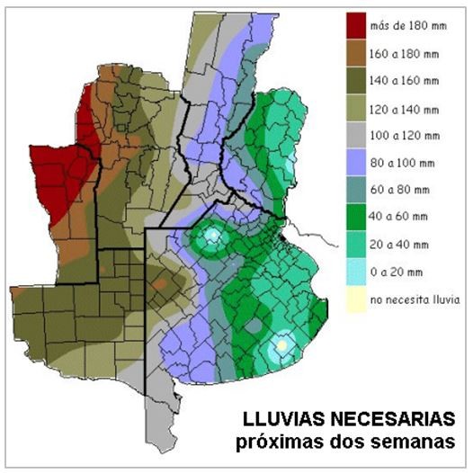 En el mapa de que estima las lluvias necesarias para obtener reservas de humedad adecuadas en las próximas dos semanas, fácilmente se detecta la línea de cien milímetros, la cual de alguna manera divide la región pampeana entre este i oeste. Partiendo del estado actual de humedad, esta estimación permite notar que la demanda crece en forma significativa hacia el oeste. Es posible que el escenario a campo no sea tan prolijo como lo muestra el mapa, es decir puede haber áreas reducidas donde las lluvias hayan sido más importantes y en consecuencia la demanda puede ser menor, sin embargo, a gran escala, el patrón que presenta el mapa es válido y la demanda de precipitaciones crece de este a oeste. En principio es improbable que esta demanda se vea satisfecha, pero pueden lograrse mejoras parciales.