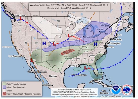 Veamos el pronóstico. Las dos grandes áreas coloreadas en blanco revelan nevadas. Y las demás muestran lluvias y tormentas.