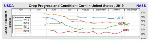 La información dada por USDA- NASS es más que relevante. Acá vemos el progreso de la cosecha y la condición. El rojo corresponde al 2019.
