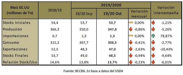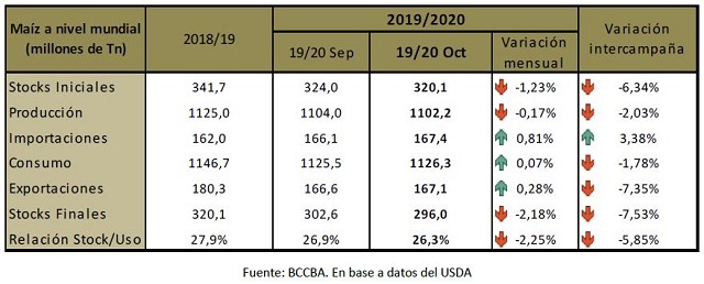 Con la cosecha entrando en su tramo final en los Estados Unidos y problemas climáticos que hicieron que las tareas fueran más lentas del normal, el nuevo reporte del USDA estima una producción de maíz para el país del norte en 347 millones de toneladas, por encima de lo esperado por los privados. De acuerdo con el último dato disponible, la cosecha de maíz en Estados Unidos presenta un avance del 52% contra el 75% del promedio de las últimas cinco campañas. En las próximas semanas a medida que el clima lo permita es de esperar que las labores tomen mayor velocidad y se vayan completando. Con relación a los stocks finales, fueron estimados en 48,5 millones de toneladas, lo cual representa 2,8 millones de toneladas más que el mercado (45,7 millones de toneladas).