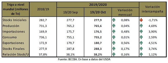 En trigo, la producción de la campaña 2019/20 sería de 765,6 millones de toneladas, lo cual representa un aumento frente el informe previo de 400.000 toneladas. Respecto a los stocks finales globales del ciclo 2019/20, alcanzarían los 288,3 millones de toneladas, 1,5 millones de toneladas más que lo estimado por privados (286,8 millones de toneladas).