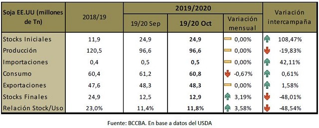 De acuerdo con el último dato disponible, el avance de la cosecha estadounidense de soja a la fecha es del 75% contra el 87% promedio para los últimos cincos años. Más allá de este retraso, en las últimas semanas las labores de recolección han tomado un mayor ritmo. Acercándose al final de la cosecha 2019/20, el organismo norteamericano mantiene la producción en 96,6 millones de toneladas, 1 millón de toneladas por encima de lo que esperaba el mercado. Respecto a la proyección de stocks finales, los mismos alcanzarían los 12,9 millones de toneladas, 400.000 toneladas más que el reporte previo y 1,2 millones de toneladas por encima del mercado (11,8 millones de toneladas).