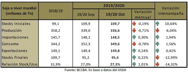 Para la nueva campaña, la producción mundial sería de 336,6 millones de toneladas, reflejando una caída respecto al reporte de octubre de 2,4 millones de toneladas. En cuanto a las existencias del ciclo 2019/20, se proyectan en 95,4 millones de toneladas, cuando el mercado esperaba 95,3 millones de toneladas.
