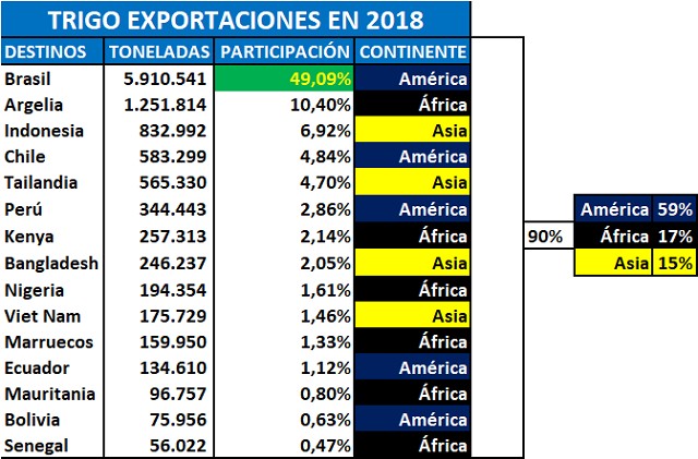 El presidente electo no buscó acercar posiciones con Bolsonaro, más bien todo lo contrario, y en el medio de este entuerto el bendito TRIGO 19-20 sigue siendo rehén de toda esta historia. Antes de entrar en la actualidad vale recordar en el cuadro siguiente los destinos de nuestras exportaciones de Trigo durante el 2018, con el detalle de sus participaciones. Hemos vendido Trigo en ese año a 33 países, de los cuales los primeros 15 implican algo más del 90%; y sólo Brasil representó casi el 50%.