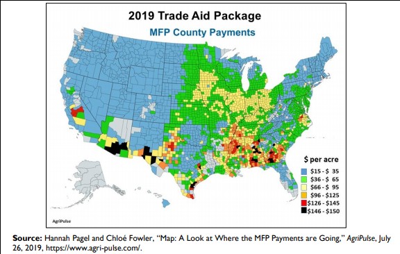 El Farmer recibirá el 2do “pago” de los 16 mil millones de dólares, por parte del gobierno en forma de “compensación por los efectos de la guerra comercial” este segundo pago es del 25%, ya habiendo recibido un 50% y restando otro 25% para enero (dependido si se llega a un acuerdo o no con China). El rango de pago es de 15- 150 dólares por acre y la distribución de esto es por condado según los cultivos que se realizan y sus proporciones. (ver gráfico) El año pasado esta compensación le costó al gobierno de Trump 12 mil millones de dólares.